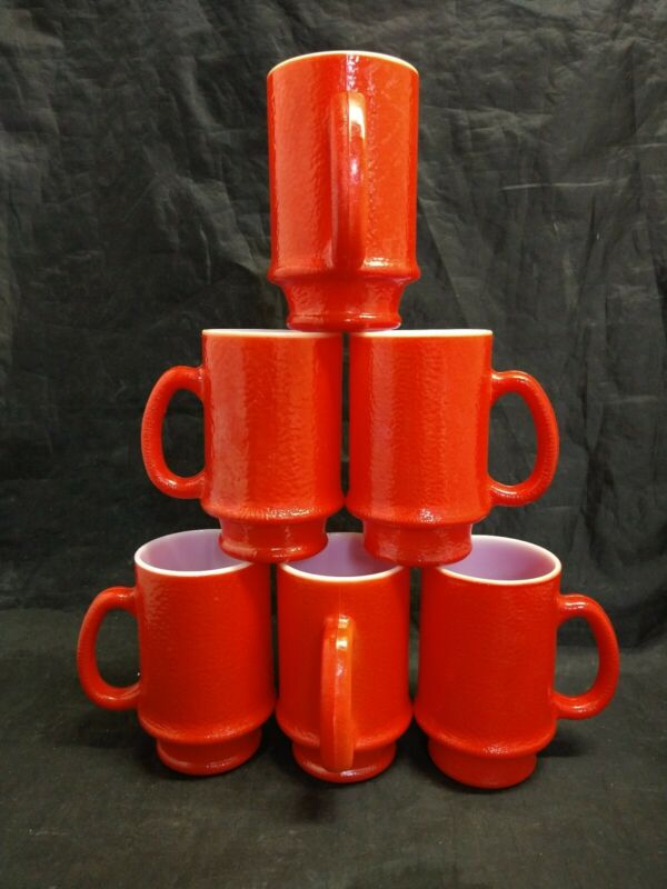 6 Vintage Red Pebble Texture Milk Glass Coffee Cups