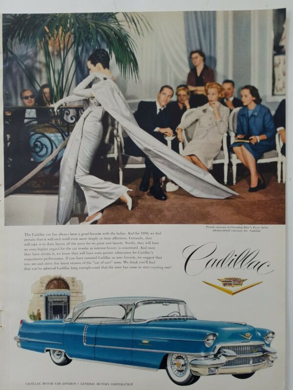Title (ebay affiliate link): 1956 blue Cadillac Sedan DeVille car Christian Dior salon fashion vintage ad