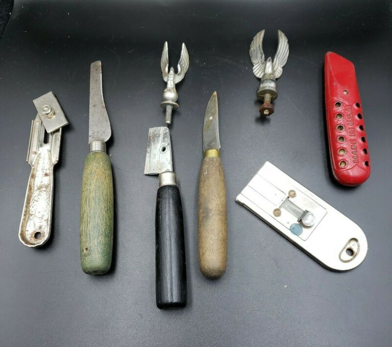 Title (ebay affiliate link): Lot Of Vintage Antique Knives Wood Handle Cast Iron Cobbler Tool?