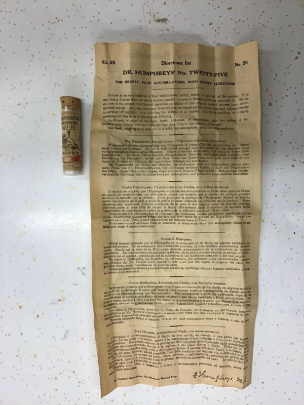 Title (ebay affiliate link): Vintage Humphreys Medicine Homeopathic # 25, Dropsy, Bottle and Directions