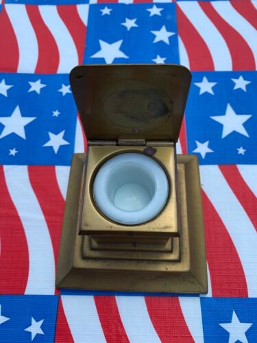 Antique Columnar Brass Ink Well Milk Glass Insert