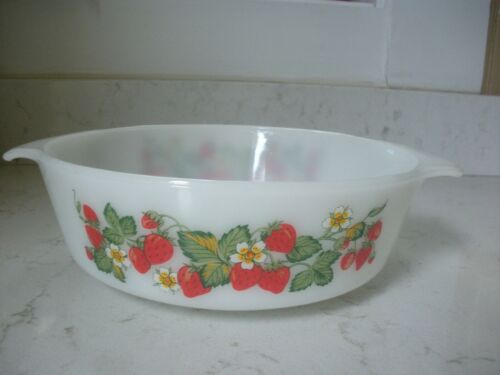 vintage anchor hocking ? casserole milk glass strawberry strawberries 1 1/2 qt.