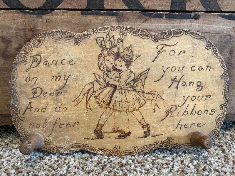 Title (ebay affiliate link): Vintage Antique Wood Pyrography Little Girl Ribbon Holder Dance My Dear