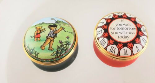2 HALCYON DAYS ENAMEL SMALL BEARS GOLFING and CLOCK MINIATURE BOX