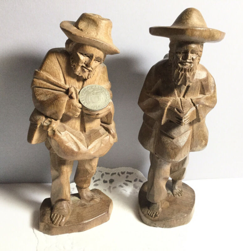 Title (ebay affiliate link): NICE VINTAGE PAIR OF HAND CARVED WOODEN FIGURES ON W/REAL COIN MEN HATS BACKPACK