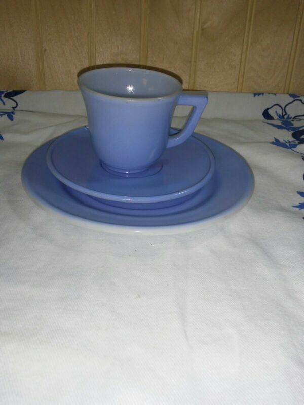 VTG Hazel Atlas Child''s 3Pc Tea Set Pastel Blue Cup Saucer Plate Milk Glass