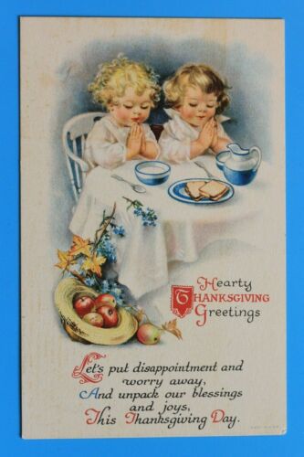 HEARTY THANKSGIVING GREETINGS children praying at table poem, Wolf & Co postcard