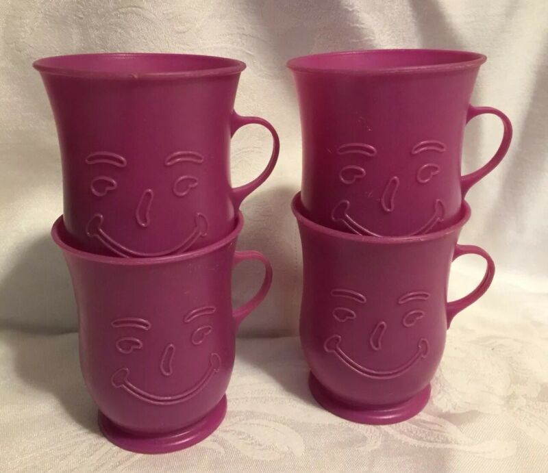 Set of (4) Vintage 1970''s Purple Smiley Kool-Aid Man Face Plastic Cups