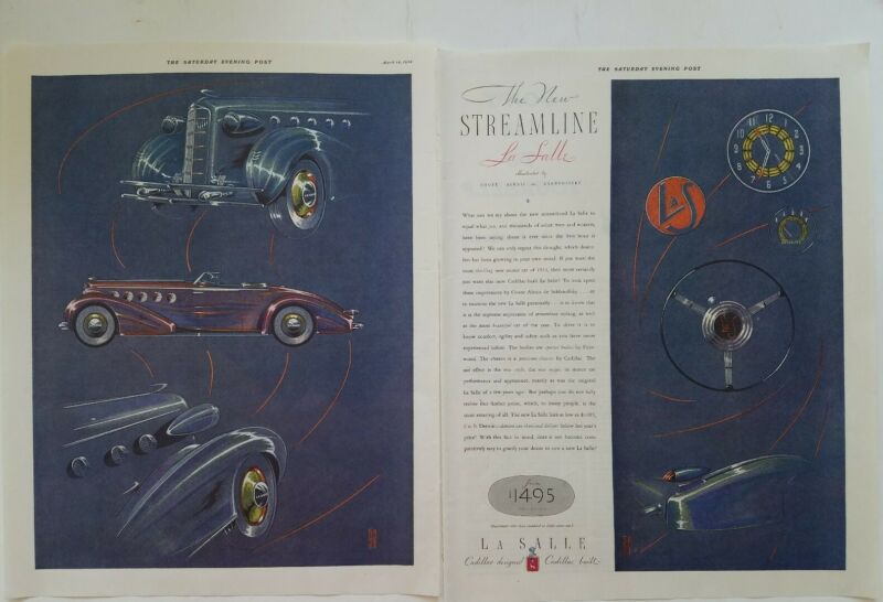 1934 Cadillac LaSalle car and parts Count Alexis de Sakhnoffsky art 2 page ad