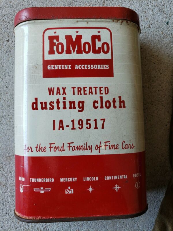 Title (ebay affiliate link): Vintage Ford FOMOCO Tin Can Dusting Cloth Gas Oil