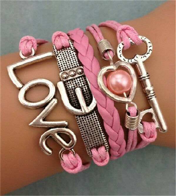 Title (ebay affiliate link): Infinity Love Heart key Friendship Antique Silver Leather Charm Bracelet C001