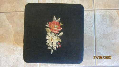 Vintage Black floral needlepoint small footstool 10x10x8 inches Queen Anne style