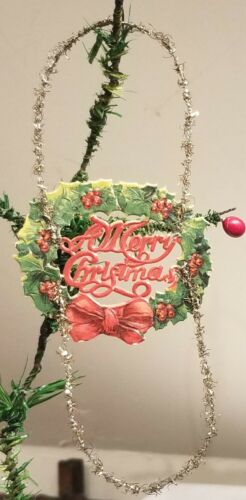 Title (ebay affiliate link): "Merry Christmas" in Holly Wreath. Tinsel & Paper Christmas Ornament.1900s