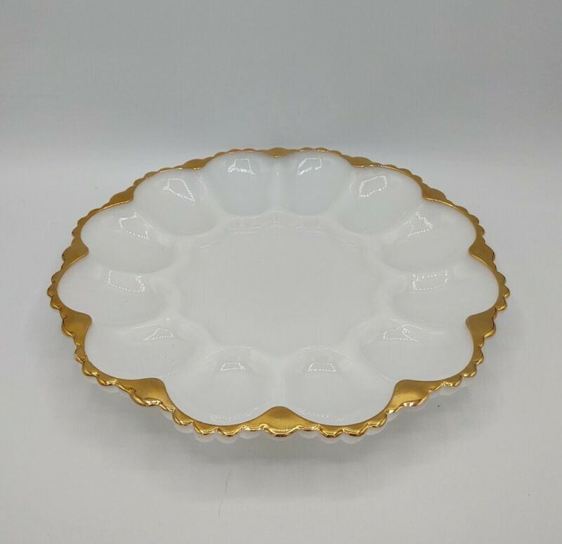 Title (ebay affiliate link): Vtg Fire King White Milk Glass Deviled Egg Plate Dish Gold Trim Anchor Hocking