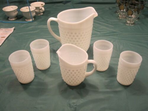 Title (ebay affiliate link): Vtg Anchor Hocking Fire-King Milk White Hobnail Beverage Set pitchers & tumblers