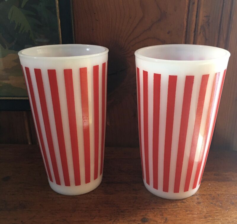 2 VINTAGE HAZEL ATLAS MILK GLASS RED STRIPE TUMBLERS