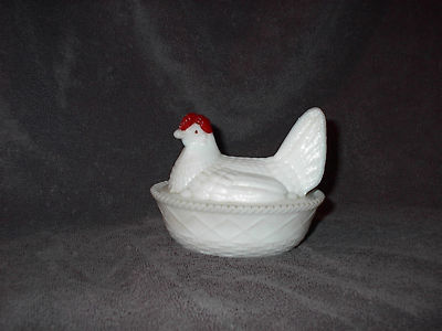 Vintage White Milk Glass Chicken on a basket dish