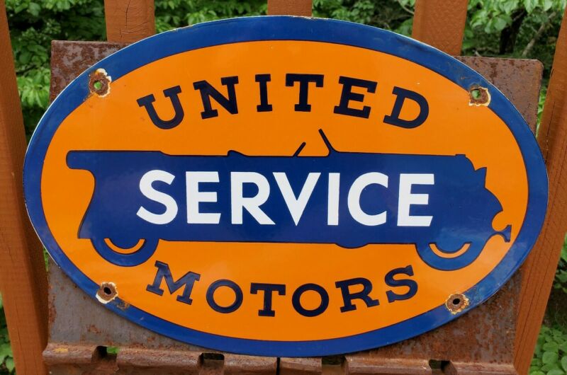 Title (ebay affiliate link): VINTAGE UNITED MOTOR SERVICE 16.5"" PORCELAIN METAL GENERAL GM GASOLINE OIL SIGN