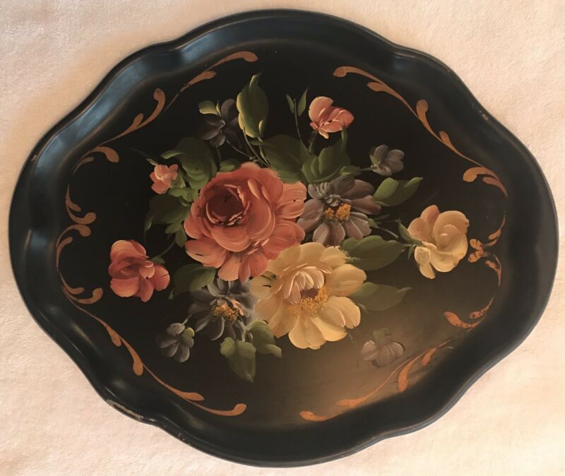 Title (ebay affiliate link): Vtg Black Tole Hand painted Metal Serving Tray Floral W/Gold scroll 17" x 14"