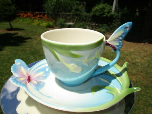 B- CUP SAUCER GODINGER BUTTERFLY & LILY WHIMSY FARE LIME GREEN AQUA BLUE