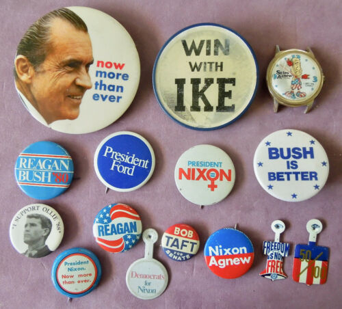 SPIRO AGNEW DIRTY TIME WATCH &13 REPUBLICAN BUTTONS NIXON/REAGAN/FORD /BUSH/IKE