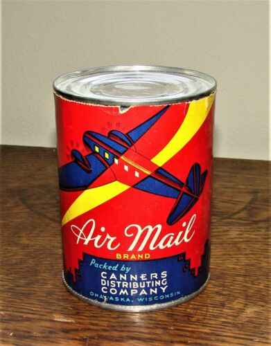 Title (ebay affiliate link): 1940s RARE AIR MAIL BRAND PEAS EMPTY CAN, ONALASKA WIS. AIR MAIL PLANE ON CAN