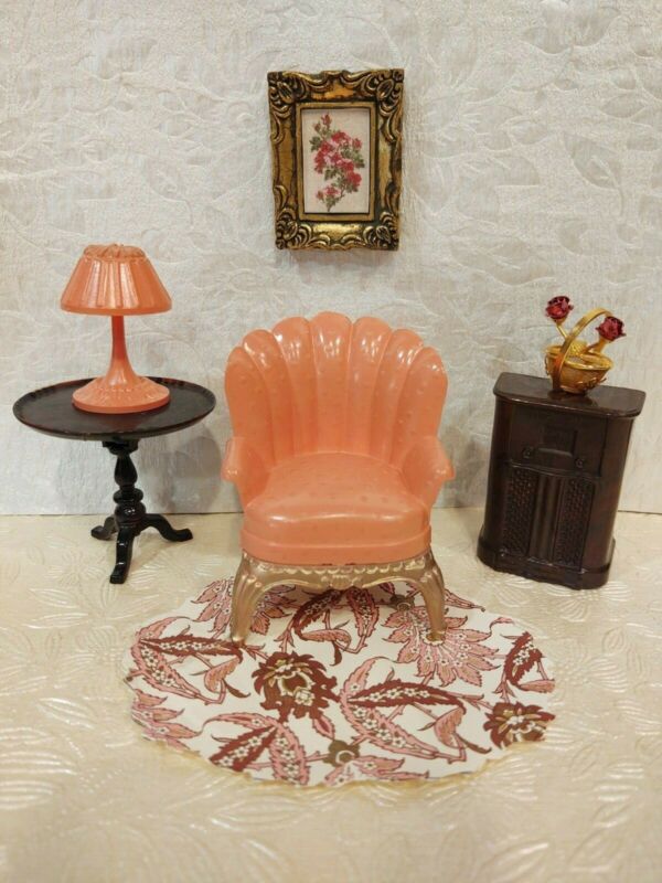 Title (ebay affiliate link): Rare CORAL PINK LADIES CHAIR w/ LAMP TILT TABLE RADIO Mini Dollhouse Furniture