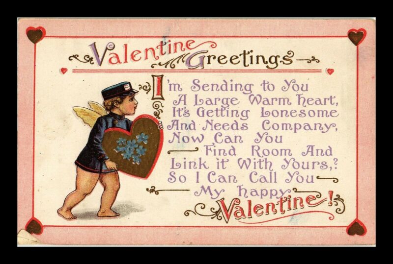 Title (ebay affiliate link): US POSTCARD VALENTINE GREETING POEM EMBOSSED CUPID CARRYING HEART