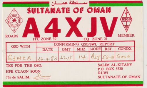 Title (ebay affiliate link): QSL Ruwi Sultanate of Oman from Dalim Al-Kitany from 1983