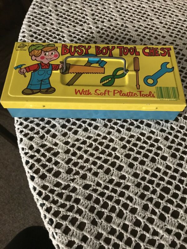 Title (ebay affiliate link): Vintage Ohio Art Busy Boy Tool Chest Metal Toy Tool Box with tools vintage toys