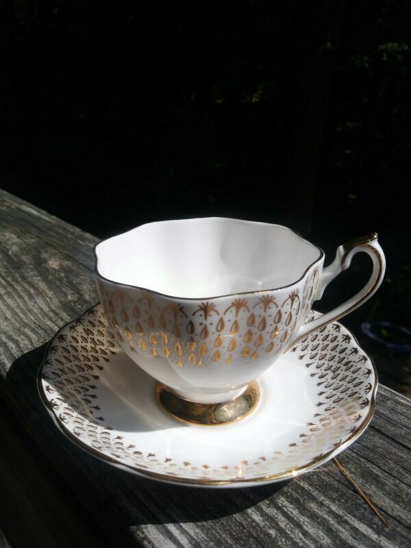 Title (ebay affiliate link): QUEEN ANNE ENGLAND TEA CUP & SAUCER GOLD Drops and Trim 201 Scalloped Edge