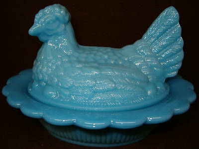 BONNIE BLUE MILK GLASS HEN CHICKEN ON NEST BASKET DISH