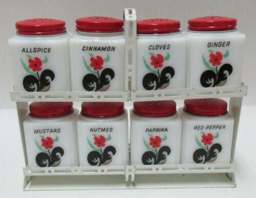 Title (ebay affiliate link): 8 VTG McKEE TIPP CITY SHAKER SPICE JARS RED FLOWER MILKGLASS RED LIDS & RACK