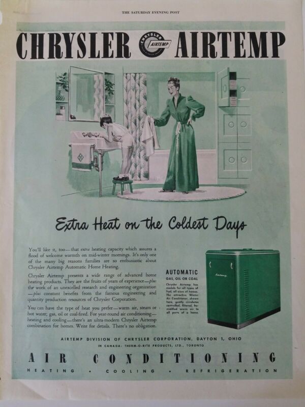 1946 Chrysler Airtemp air conditioning bathroom scene boy underwear mom robe ad