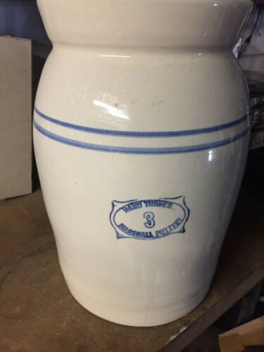 ANTIQUE MARSHALL POTTERY 3- GALLON CREAM BLUE CROCK TEXAS U.S.A.-1