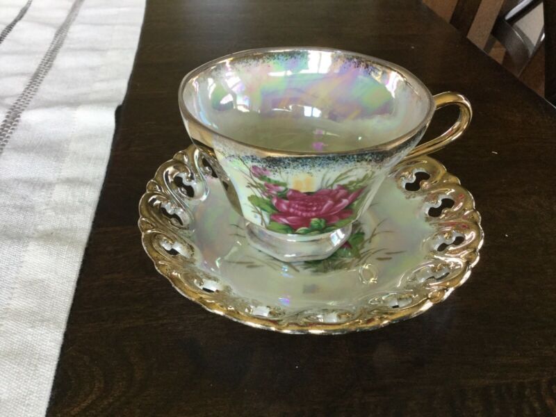 Bone China Tea Cup & Saucer Porcelain Floral Irridescent With Gold Trim VTG