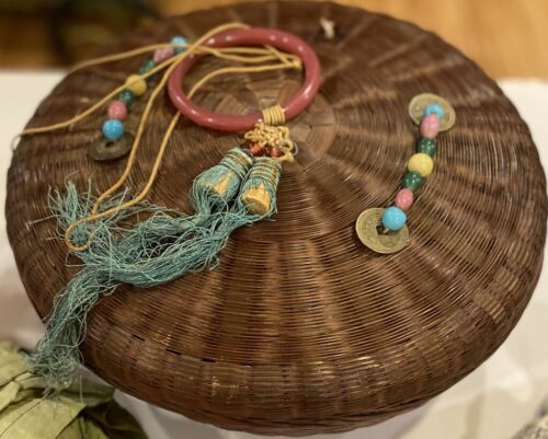 Title (ebay affiliate link): Antique Larger Sized Sewing Basket w/Peking Glass Beads Great for Doll!