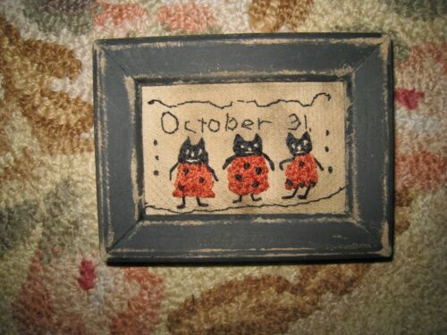 Primitive tiny Sampler~3 Black Cats~October 31 Halloween Folk Art ~Old textile ~