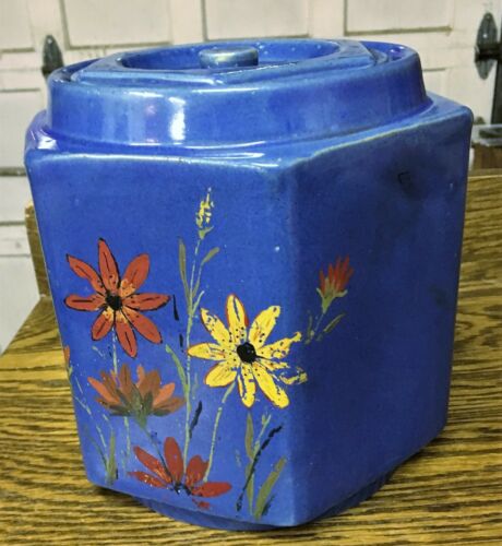Title (ebay affiliate link): Vintage Blue Crock/Cookie Jar Stoneware SIX~Sided Canister/Lid~Unusual~FARMHOUSE