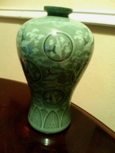 Antique Korean Celadon Hand Painted Porcelain Cranes Vase 8.5"