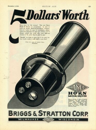 Title (ebay affiliate link): 1924 Briggs & Stratton BASCO Ad: Motor Driven Horn - Milwaukee, Wisconsin