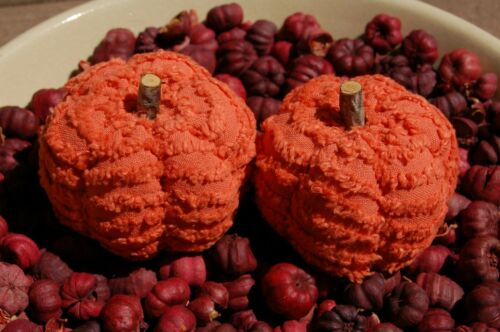 Primitive Fall Halloween Two Small Hand Dyed Orange Chenille Pumpkin Ornies