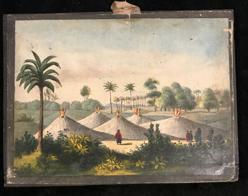 Antique Picture Of Volcanoes And Inhabitants- German