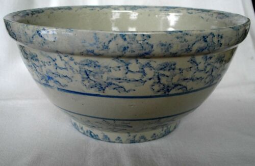 Antique Vintage Blue Stoneware Sponge Ware Mixing Bowl 11"