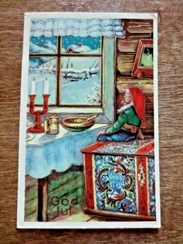 Title (ebay affiliate link): 1950s Norway Gnome God Jul Merry Christmas Winter Cabin Scene Postcard Posted