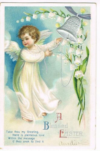 Title (ebay affiliate link): ANTIQUE EMBOSSED EASTER Postcard CHERUB, WHITE GOWN, RINGING BELL