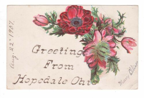 Title (ebay affiliate link): 1907 Flowers Raised Design Embossed Glitter Greeting Post Card from HOPEDALE, OH