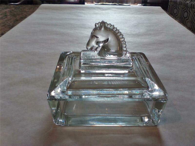 Title (ebay affiliate link): Elegant Depression Glass Heisey Crystal HORSE Head Finial Trinket Box W/ Lid