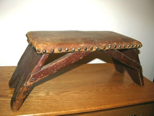 Title (ebay affiliate link): ANTIQUE PRIMITIVE SPLAYED LEG BENCH / OLD PAINT & LEATHER TOP