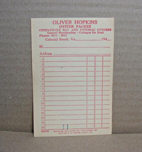 1940''s Oliver Hopkins Oyster Packer invoice page Colonial Beach Va. no tin can